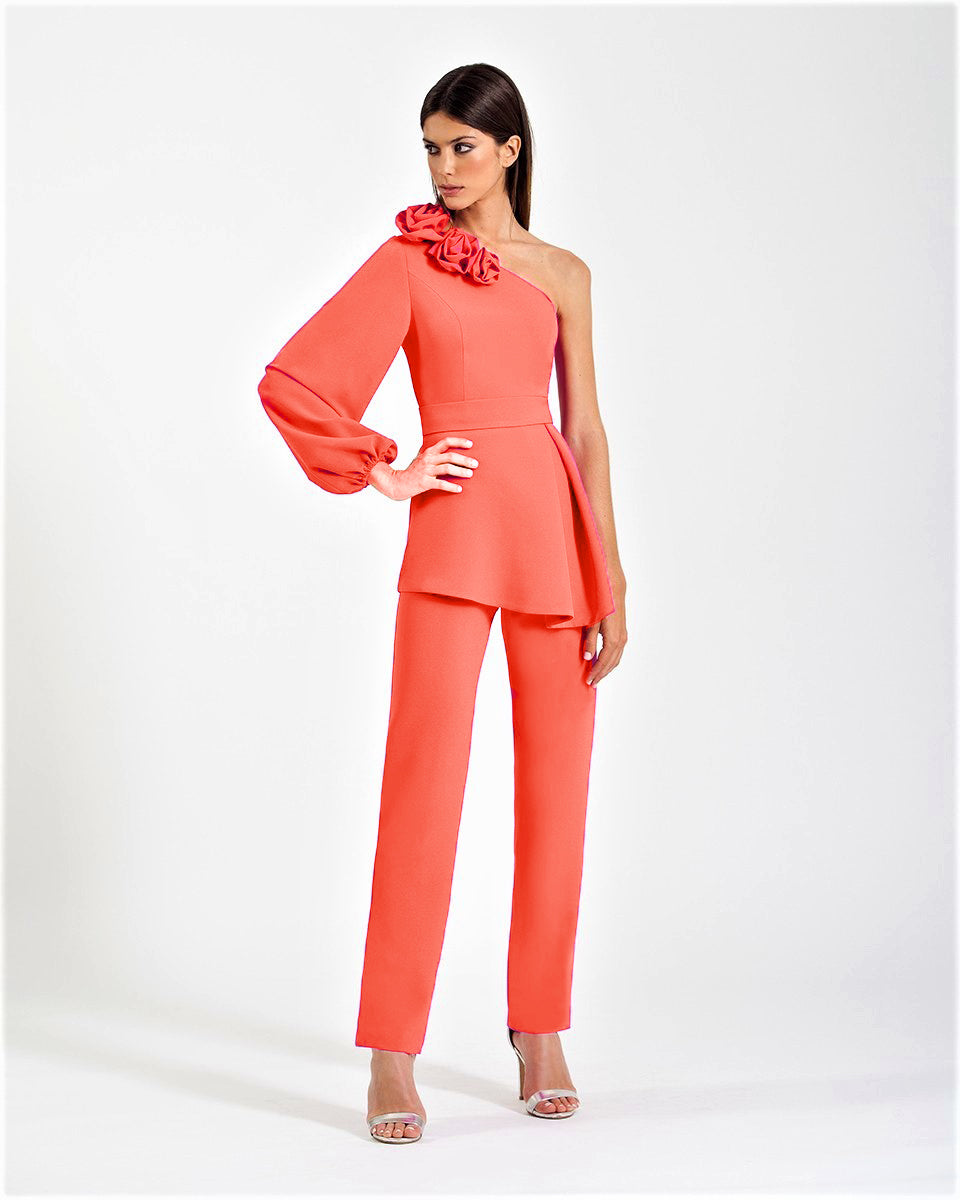 - Parte superior asimétrica con flores de tela.
