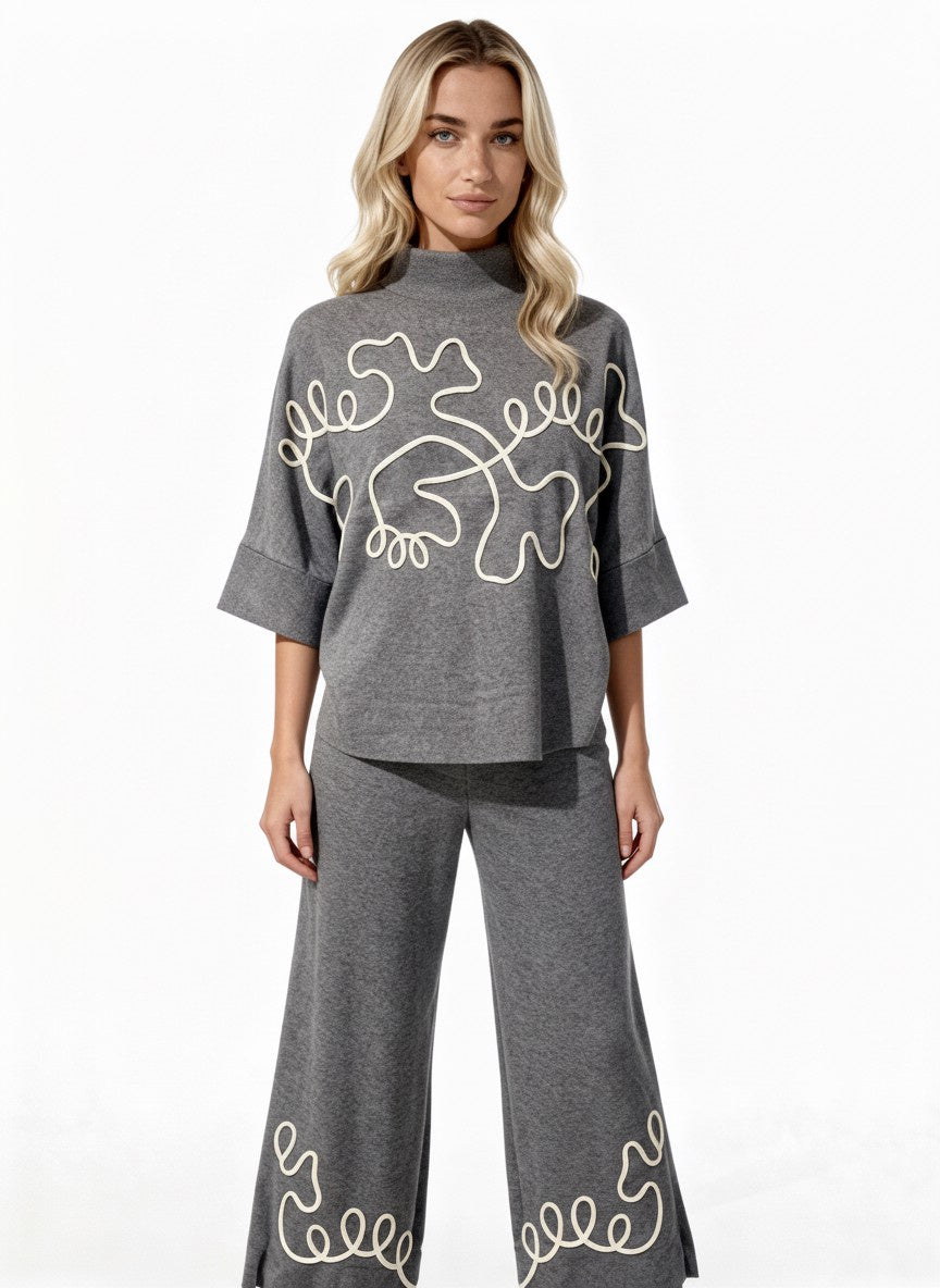- Pantalón con cintura elástica y pierna ancha con bordado.
