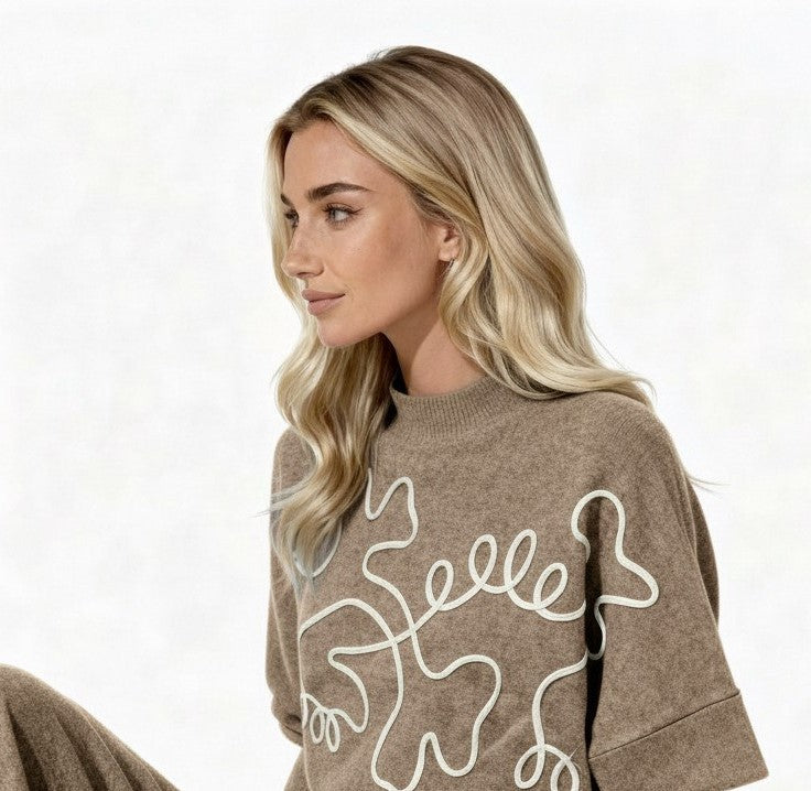 - Jersey bordado con cuello perkins con manga al codo con dobladillo.