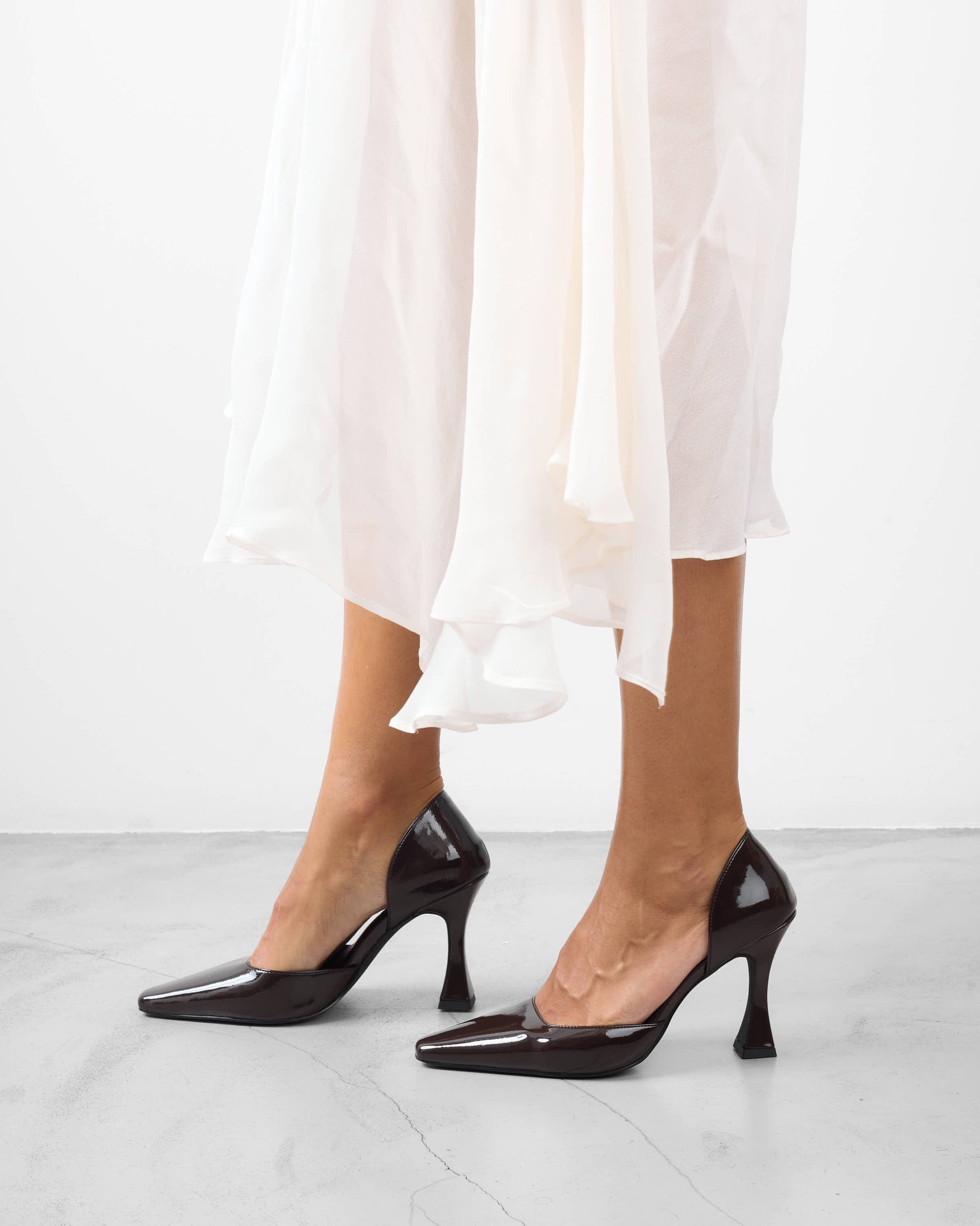 - Zapato de tacón en punta cerrado con tacón fino y cuadrado en color chocolate.