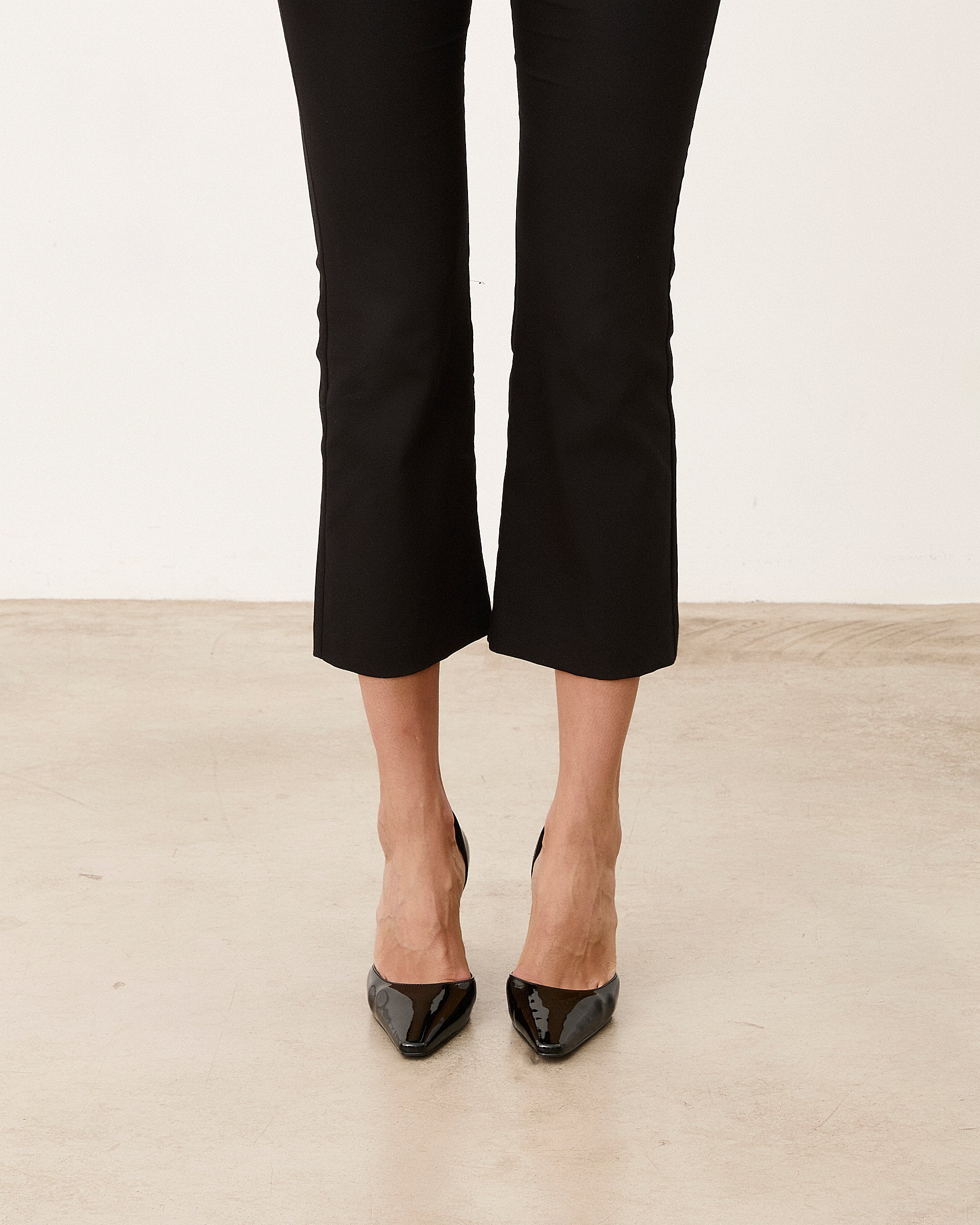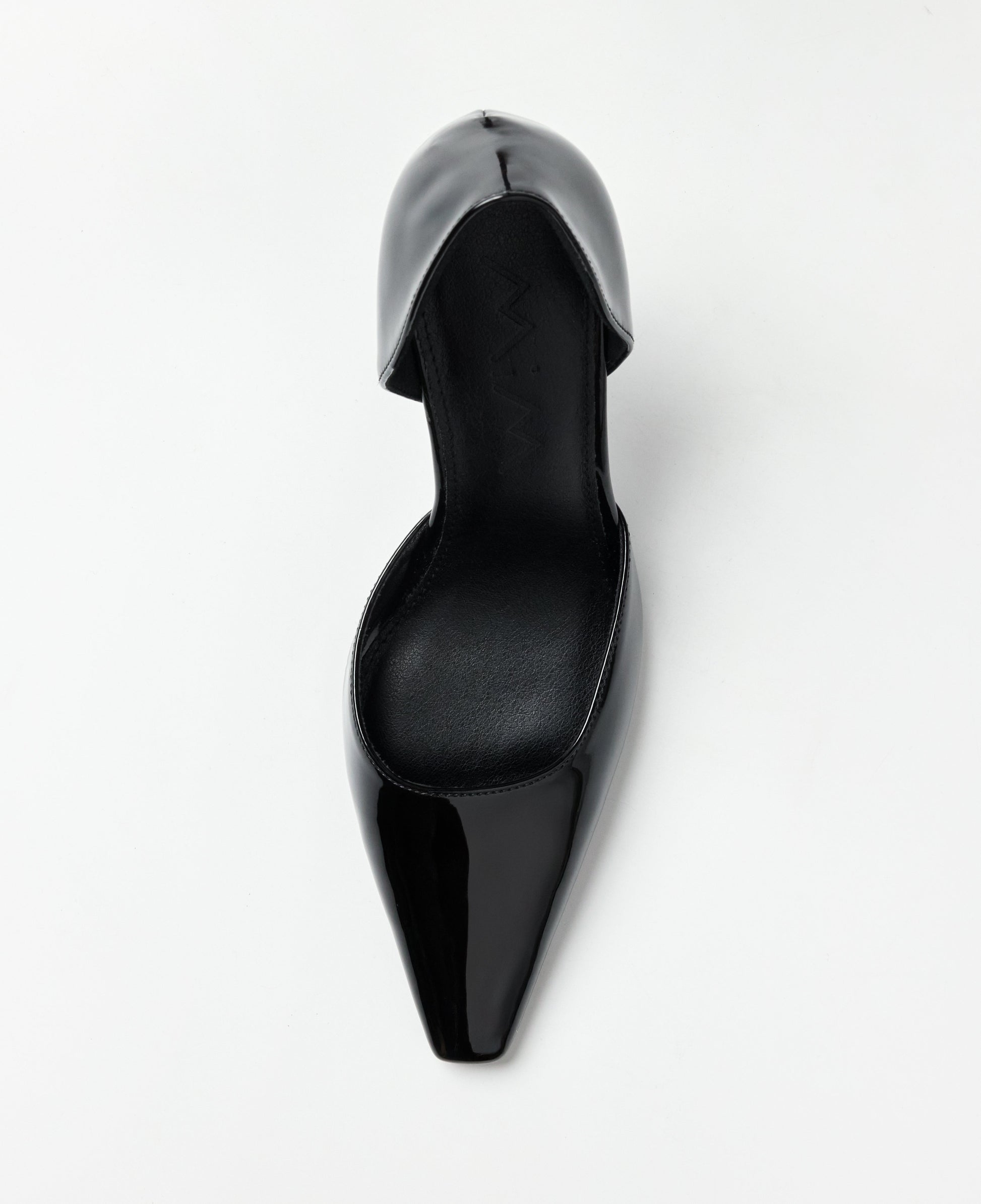 - Zapato de tacón en punta cerrado con tacón fino y cuadrado en color negro.