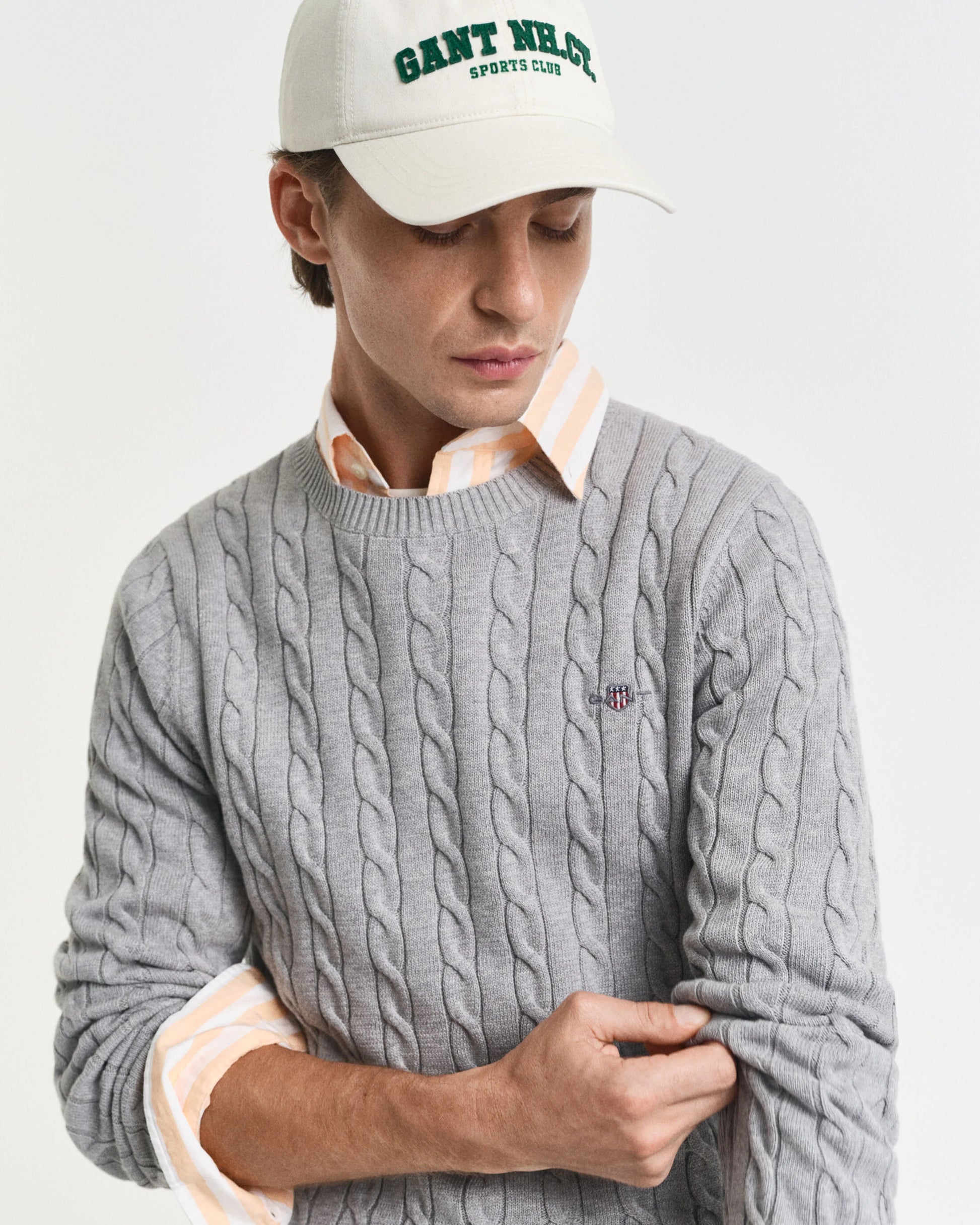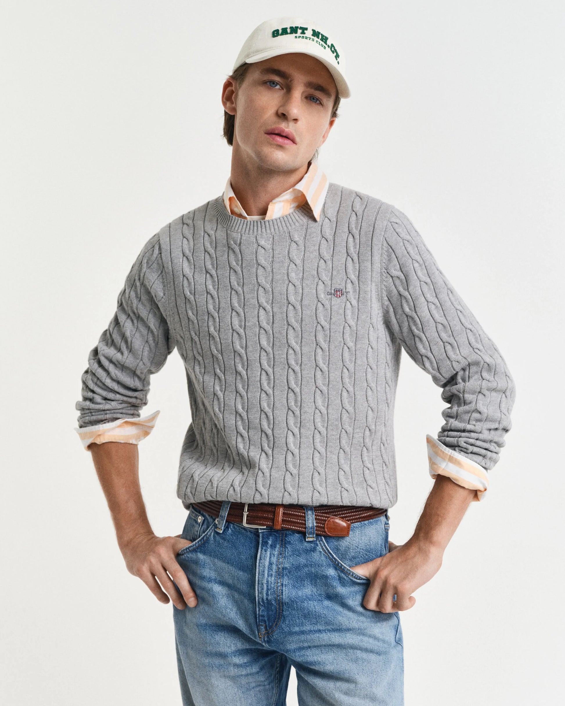 Un jersey «preppy» de punto de ochos, diseñado en un suave algodón con lustre perfecta para los meses más fríos. Está diseñado con corte normal y presenta cuello redondo clásico, detalles acanalados en el bajo y los puños, y nuestra emblemática insignia GANT bordada en el pecho.