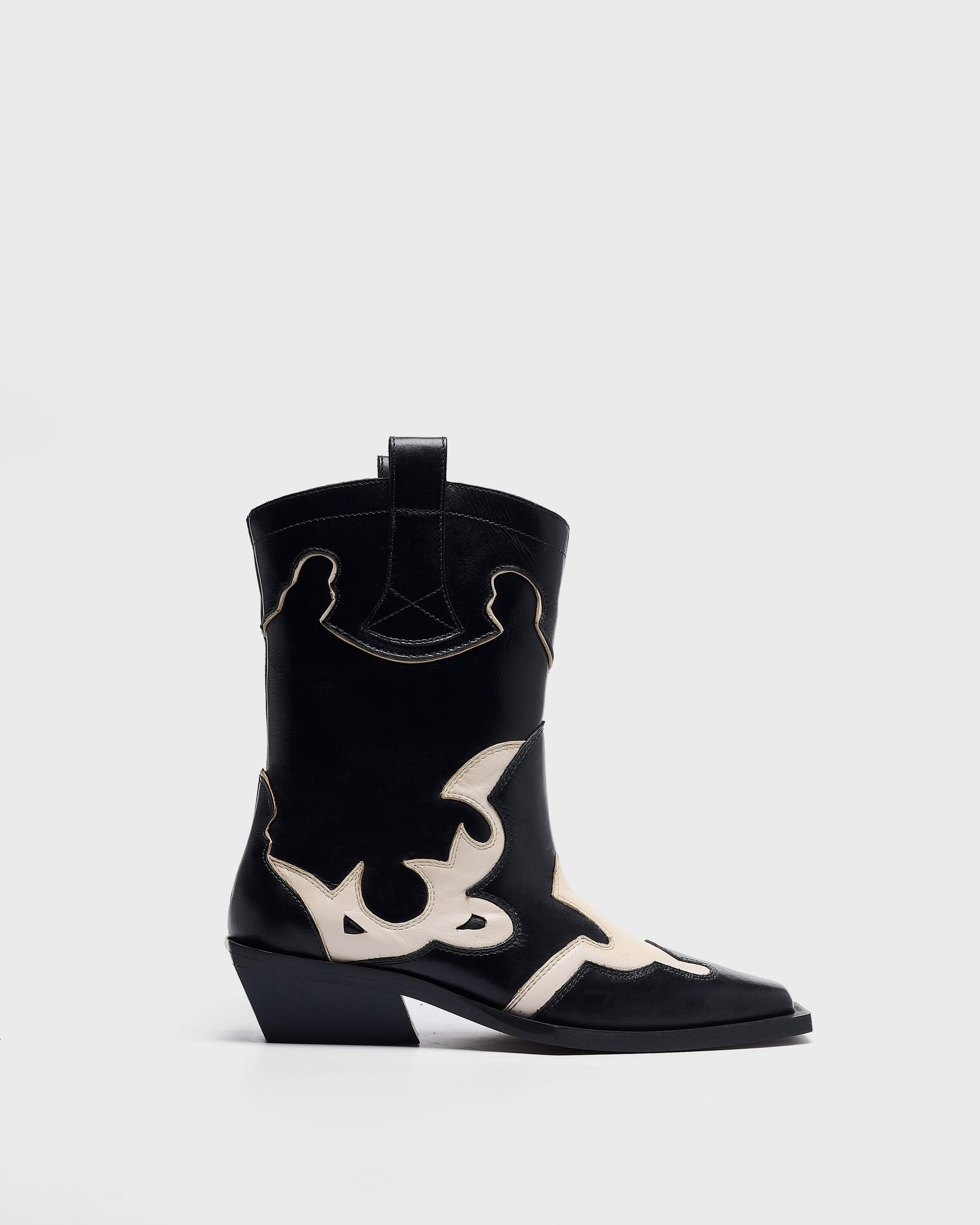 - Bota cowboy de tacón en piel negra con detalles blancos.